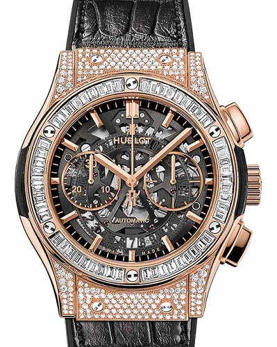 各界のセレブやビジネスリーダーに愛用者が実に多く、今最も注目されていると言っても過言ではないスイスの高級時計ブランド ウブロ。ウブロはフュージョン(融合)をコンセプトにし、スイス伝統のトラディションとユニークな素材の融合、21世紀の時計作りに合わせた芸術性の融合を掲げ常に他にはない新しい新作を発表し続けております。ウブロの強みともいえるきわめて明確なアイデンティティである芸術の融合、このほかのブランドには中々類を見ない能力こそが常に伝統と革新が共存するタイムピースを生み続けています。その中で2015年の新作「アエロフュージョン クロノグラフ キングゴールドジュエリー」Ref:525.OX.0180.LR.0904 スポーティなデザインとシックでエレガントな文字盤にベゼルダイヤモンドでステータスを象徴し、まさにウブロが掲げるテーマでもあるフュージョン(融合)の集大成ともいえるモデルとなります。